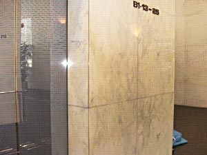 広く長いエントランスは、その入口から高い壁面の空間の白大理石アラベスカートの羽目施工、 そして、その模様合わせまでも、実にそつがなく、エレベーターホールの壁面に見事に集約されていて、設計、施工に携わった人たちの「粋」な心意気といったものが伝わってきます。